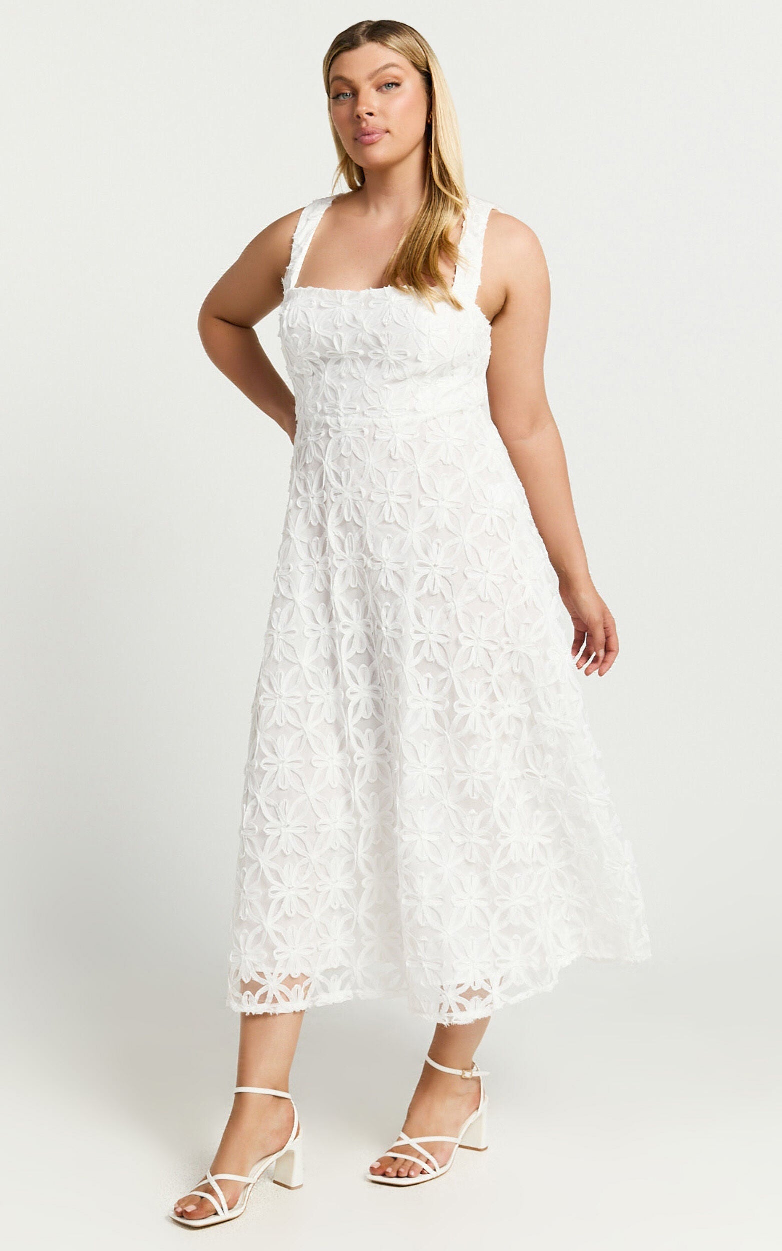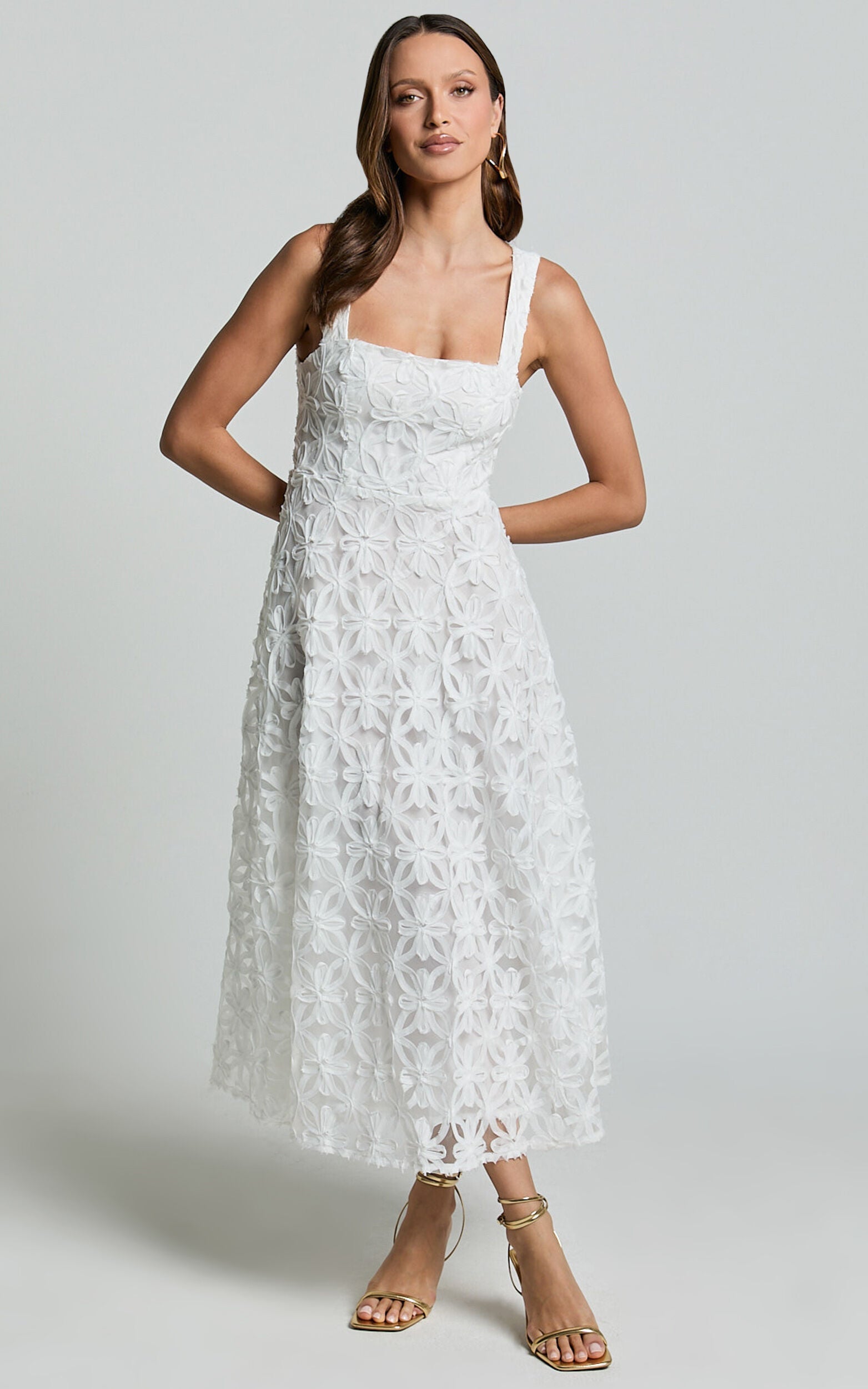 Get ready to turn heads in the Clarissa Midi Dress. This stunning white dress is perfect for any party or day out. With its square neck and open back design, it exudes confidence and style. The fit and flare silhouette flatters every body shape, while the delicate embroidery adds a touch of femininity. Made from high-quality polyester fabric, this sleeveless midi dress is comfortable to wear all day long. Embrace your inner fashionista with the Clarissa Midi Dress �C because you deserve to feel absolutely fabulous!Product Details:Zips detailInner liningFit & flare styleEmbroidered fabricSquare necklineParty perfectMidi lengthSleeveless designPolyester materialSize and FitSize S / 8 length: 86cm / 33.86inMaterial and Care100% PolyesterNo Stretch